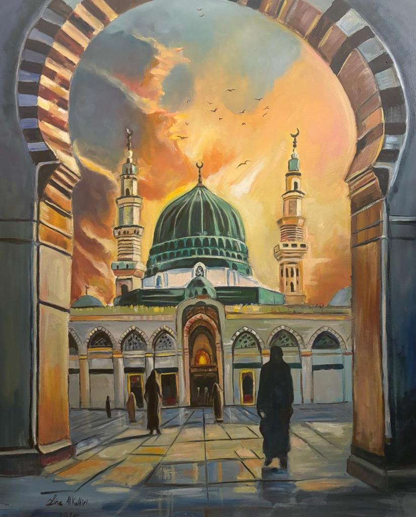 ظهور الشخصيات المتجهة نحو المسجد يرمز إلى الرحلة الروحية والقرب من الله، بينما يبرز القبة الخضراء والمآذن كرموز مقدسة تحمل معاني الإيمان والطمأنينة.