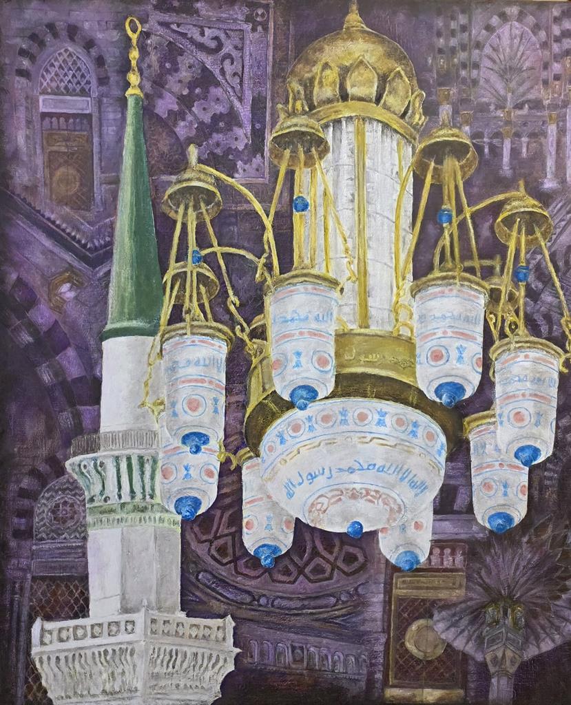 تصور اللوحة في مقدمتها جزءًا من الحرم النبوي الشريف، وتحديدًا أحد أشكال الثريات ومنارة باب السلام كما يظهر في خلفية العمل اللوحة عدداً من العناصر المعمارية للحرم النبوي، مع التركيز على الألوان البنفسجية والذهبية. الفكرة الأساسية في هذه اللوحة هي إظهار جماليات العمارة الإسلامية في الحرم النبوي الشريف.