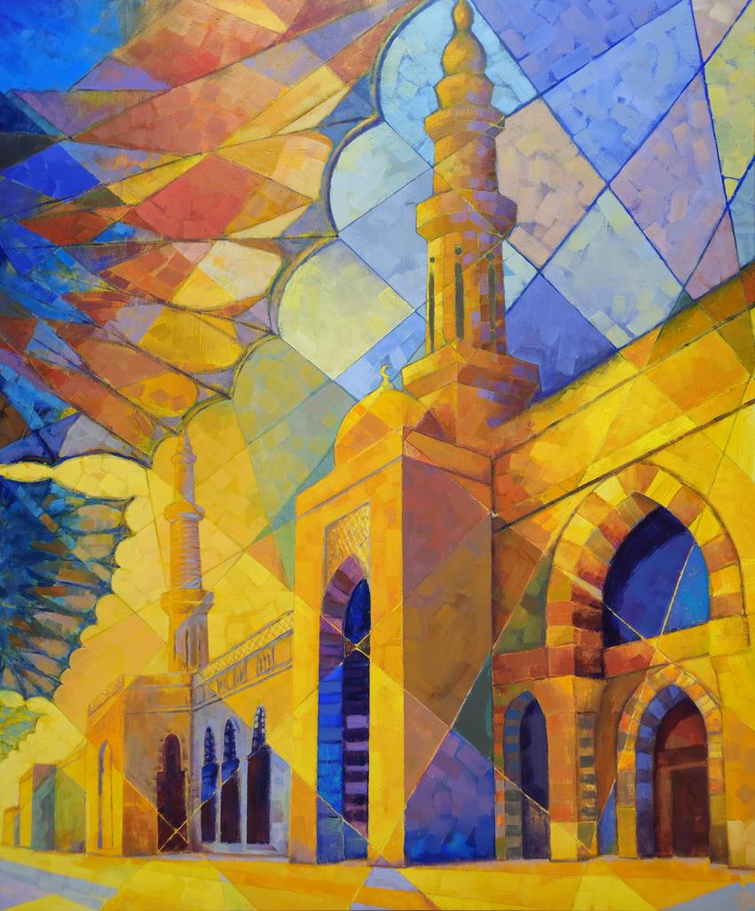 في عمله (تجلٍّ)، يعيد الفنان صياغة المشهد البصري للمسجد النبوي برؤية معاصرة تزاوج بين البنية الهندسية والتعبير اللوني. يعتمد التكوين على تفكيك المساحات وإعادة بنائها وفق منطق التجريد البنّاء، حيث تشكل الألوان المبهجة والمتداخلة وسيلة للتعبير عن التوازن بين المادي والروحي. تتدرج البرتقاليات والأصفر لتعكس دفء الأرض والحياة، بينما تستحضر البنفسجيات والأزرق البعد الروحي وسمو المعنى. يسعى العمل إلى إبراز قدسية المكان بوصفها تجربة بصرية وجدانية، تتجاوز التمثيل المباشر نحو فضاء تأملي يجمع بين الحداثة والروحانية.