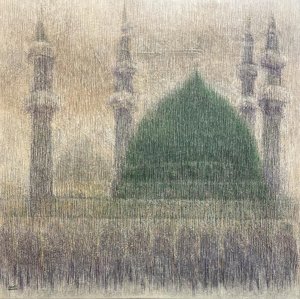 تجسّد اللوحة القبة الخضراء والمنارات في المدينة المنوّرة بأسلوب تعبيري هادئ يعكس روح السكينة والقداسة. استخدمت خطوطًا عمودية وألوانًا شفافة توحي بالمطر والرحمة، لتعبّر عن الجمال الروحي والطمأنينة التي تميز هذا المكان المبارك.