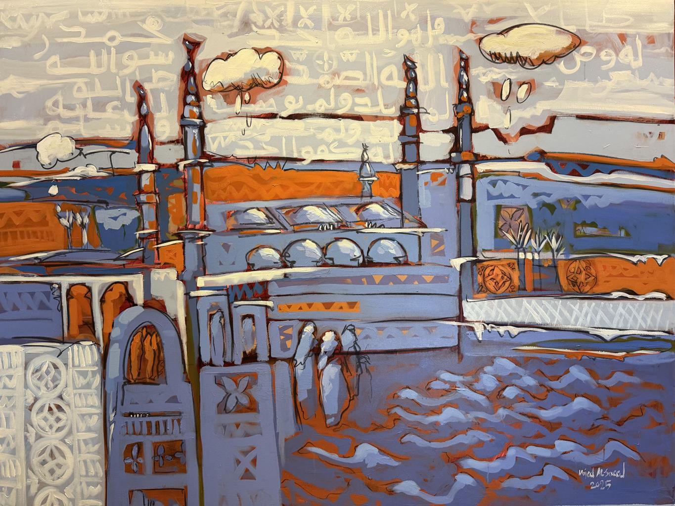 تنبض هذه اللوحة بروح المدينة المنوّرة، حيث يتداخل النور بالسكينة، وتهمس المآذن بحكايات الإيمان. تمتزج الألوان كأنها تسبيحٌ صامت، يروي سيرة المكان الطاهر بلغة القلب. في تدرجات الأزرق والبرتقالي تتجلى حرارة الشوق وصفاء الروح، ويغدو المسجد النبوي الشريف مركز إشعاعٍ روحيٍّ يضيء الوجدان، بدأت بقوافل من الإبل تنطلق بكل مكان.