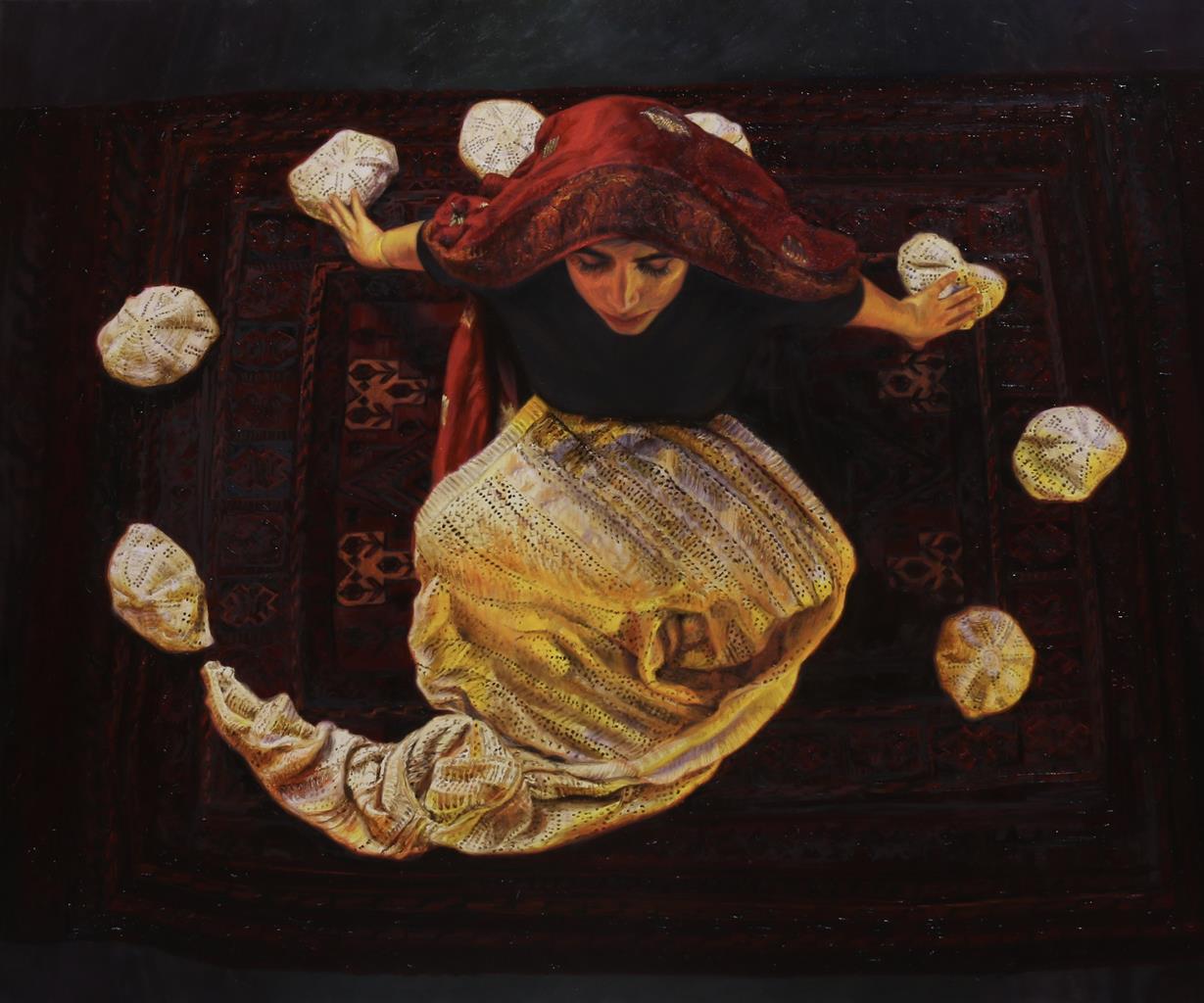 المرأة الجالسة في مركز العمل، بانحناءتها الهادئة، تجسّد حال الزائر المتبتّل، المستسلم للنور الداخلي. تحيط بها الطواقي البيضاء كدوائر من الدعاء، أشبه بحلقات الذكر في المسجد أو أرواحٍ تتناوب التسبيح حول مركز الرحمة. التباين بين الأحمر العميق للطهارة الأرضية، والبياض النقي للطواقي، يعكس التوازن بين الجسد والروح، بين أثر الأرض وصفاء النية.