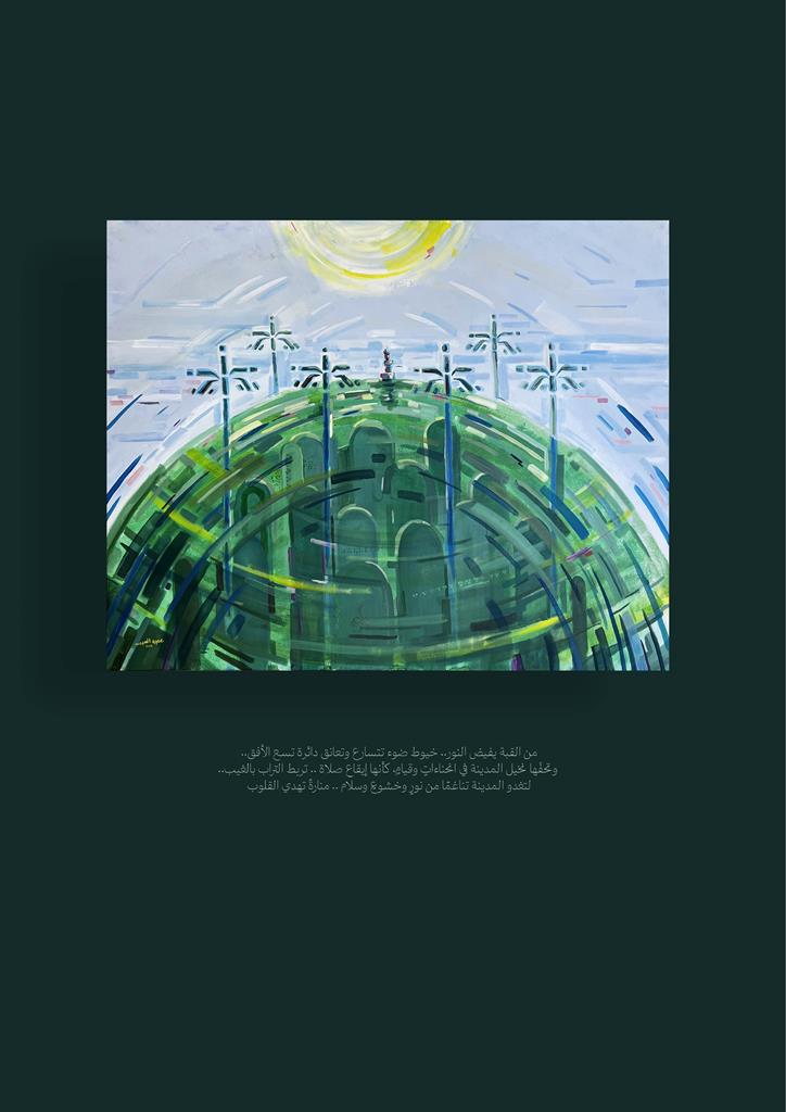 من القبة يفيض النور .. خيوط ضوء تتسارع وتعانق دائرة تسع الأفق .. وتحفّها نخيل المدينة في انحناءات و وقوفات .. كأنها إيقاع صلاة .. تربط التراب بالغيب .. لتغدو المدينة تناغمًا من نورٍ وخشوعٍ وسلام .. منارةً تهدي القلوب.