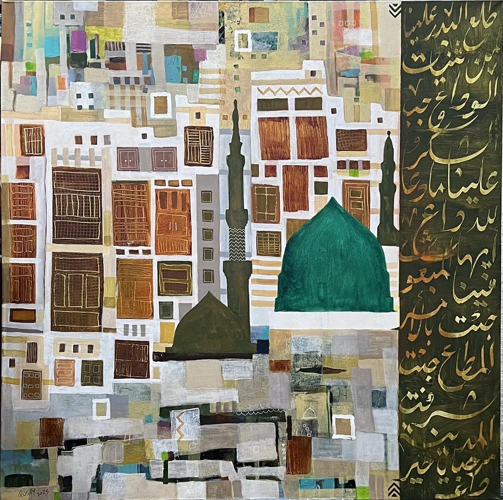حاولت في هذا العمل دمج اكثر من عنصر في عمل فني يعبر عن المدينة المنورة .. حيث الرمز عن حرم الرسول عليه الصلاة والسلام بالقبة والمنارة واطلالتها على البيوت كان الحرم يعانق جميع البيوت والاحياء في المدينة .. وقد اخترت البيوت القديمة للتعبير عن التراث المعماري المميز والجميل للمدينة .. واضفت النشيد المشهور لاهل المدينة عند استقبال الرسول حين قدومه للمدينة .. واضفت بعض العناصر كالشبابيك التراثية وبعض الزخرفة والالوان التي تتناسب مع البيثة المحلية واخرجت العمل باسلوبي الفني الخاص.