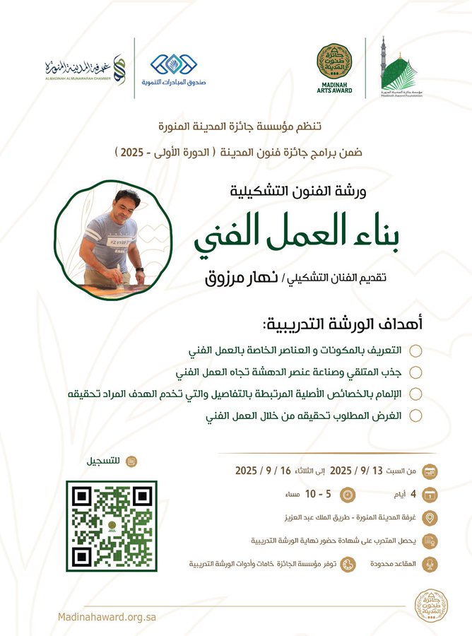 انطلقت اليوم ورشة تدريبية متخصصة في الفنون التشكيلية بعنوان “بناء العمل الفني” والتي تنظمها مؤسسة جائزة المدينة المنورة ضمن فعاليات جائزة فنون المدينة في دورته الأولى لعام 2025، ويقدّمها الفنان التشكيلي نهار مرزوق، وتستمر لمدة أربعة أيام وذلك بمقر غرفة المدينة المنورة. وتهدف الورشة إلى اكتشاف الإمكانيات الفردية للمشاركين، وتنمية قدراتهم الإبداعية، إضافة إلى تدريبهم على إنتاج أعمال فنية متكاملة من حيث التكوين والتقنيات والرسالة البصرية، بما يمكّنهم من تقديم أعمال مؤهلة للعرض في قاعات فنية متخصصة.
